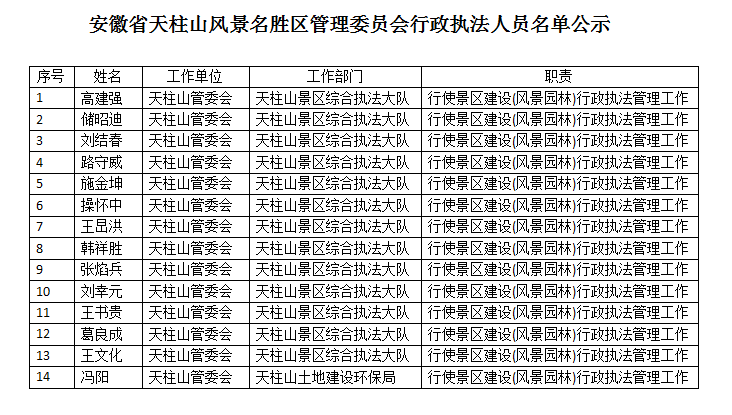安徽省天柱山風(fēng)景名勝區(qū)管理委員會行政執(zhí)法人員名單公示